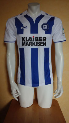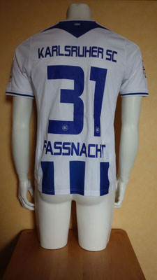 Dieses Trikot wurde mindestens für einen Einsatz von Pierre Fassnacht vorbereitet. Der damals 19-jährige Linksverteidiger wurde im Sommer 2015 von der U19 in die 2.Mannschaft des KSC übernommen. Der gebürtige Mühlburger durchlief zwischen 2005 und 2015 sämtliche Jugendmannschaften des KSC. Am 03.Spieltag der Saison 2015/2016 saß "Fassi" mit diesem Trikotmodell auf der Bank im Frankfurter Volksbank Stadion. Zur Einwechslung kam er nicht. Es sollte das einizige Mal bleiben, wo er bei den KSC-Profis zum Spieltagskader gehörte.